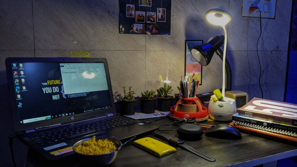 The tranquillity in the environment is being interloped by certain things such as the click of the keys, feeble tik-tik sounds from the hands of the table clock and the fan running at full speed. A book of poetry which is next on your reading list is kept above the book written by you. The two diaries are enjoying the content of the books kept above them. Some saplings, kept at the edge of the table are growing quietly, unhurriedly in bits. An obsolete phone, no longer in use, has been made usable as a paperweight. A wired earphone which may become endangered in the coming future has been protected in a small case. A bowl of maggie prepared by you is there to satiate your appetite as you know you’ll be staying awake till late and you might feel hungry. Your laptop is on standby mode because you’re thinking about writing something, perhaps fiction, non-fiction or just an excerpt. Some soft/slow music/songs have been added to the playlist that keeps changing, easing your state of mind leisurely. You’ve allowed only the amount and colour of light in your room, enough to calm you.